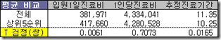 기사에서 제공한 정보 중 1인당 진료비 자료를 입원1일 진료비로 나누어 추정한 진료기간에 대한 평균을 구해보면 뇌수술의 진료기간이 25일 정도로 오래 걸리는 것을 알 수 있다. 그에 비해 백내장 수술, 하지정맥류 수술은 하루 이틀 정도로 상대적으로 짧다. 항목별로 전체와 상위 5순위 간에 차이가 있는지 확인하기 위해 T-검정(대응비교)을 실시해 본다.
